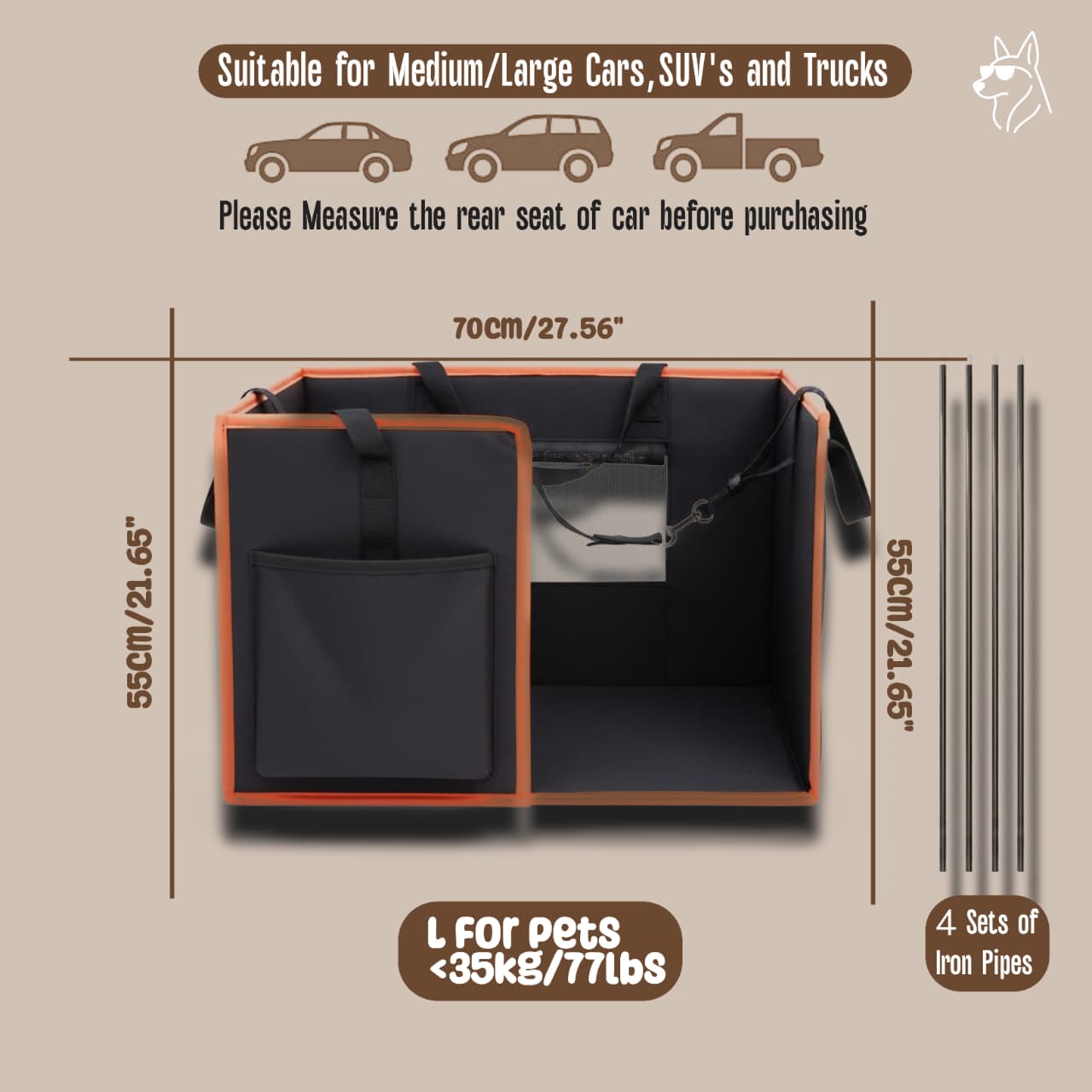 Dog car seat is ideal for medium, large dogs, providing ample space and comfort for your furry pal during car rides. It's the nice solution for traveling with your big buddy!